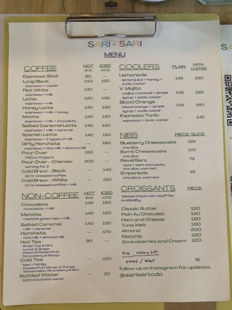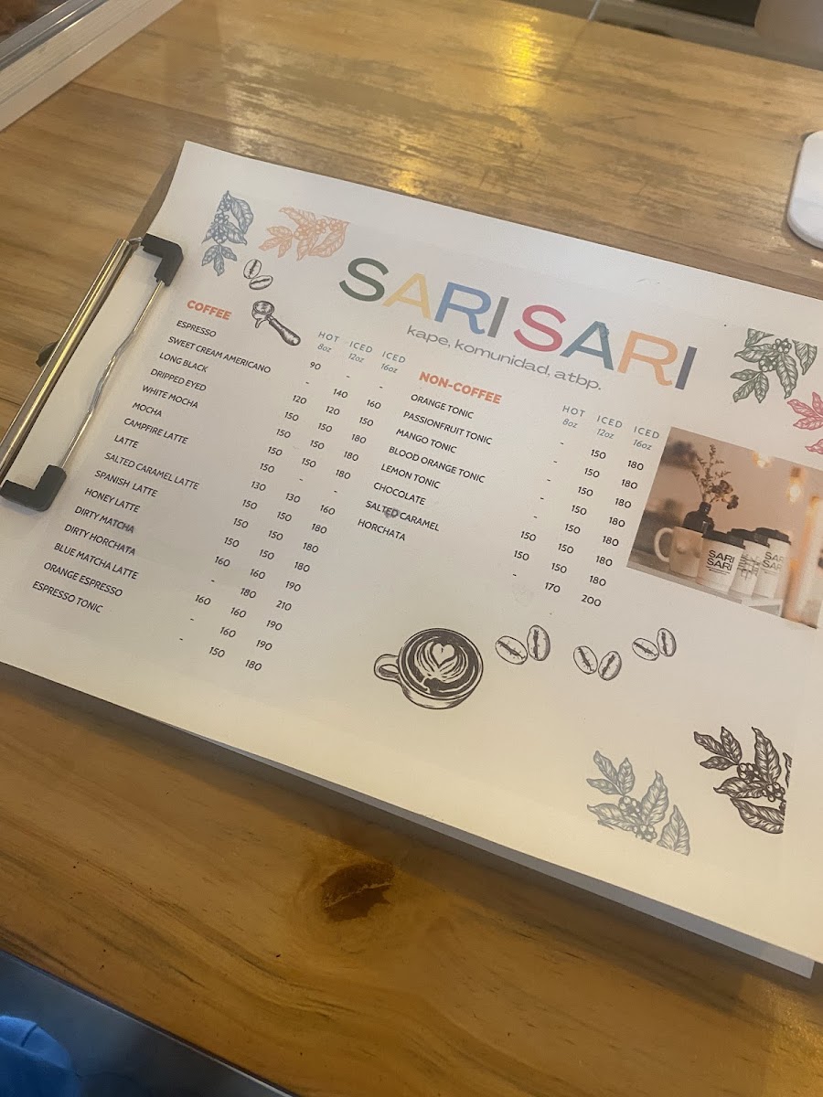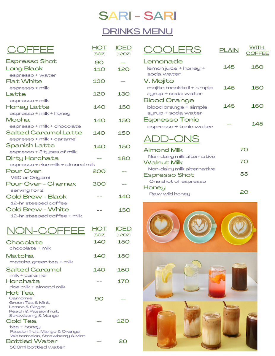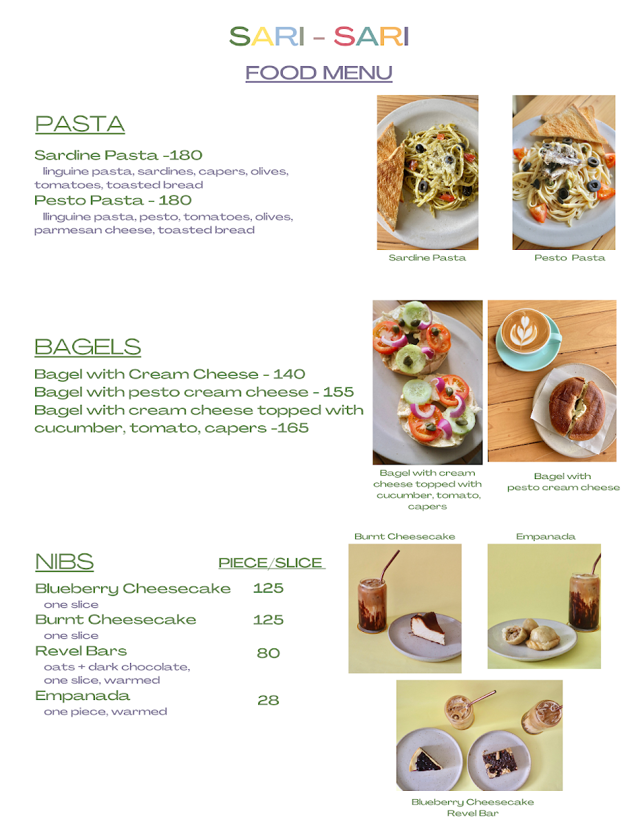 The menu at Sari-Sari Cafe offers a range of beverages and light meals suitable for coffee breaks, light dining, or casual visits. The selection includes various coffee-based drinks such as Cafe Mocha, Cold Coffee, Spanish Latte, and Dirty Horchata. Alongside the beverage choices, the menu features light food options including Pesto Pasta and Adlai Rice, providing a balance between snacks and more filling dishes. Dessert options like Burnt Cheesecake are also available to complement the drink offerings.
